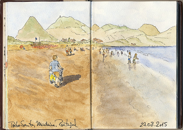 É engraçado publicar agora, com o frio a chegar finalmente, desenhos que andam no meu caderno desde o verão. São desenhos de Porto Santo, a começar pela sua capital, a bela Vila Baleira com a sua igreja matriz preparada para a festa da padroeira.