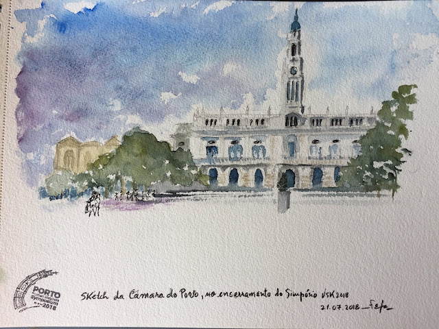 Junto o meu contributo, pintado no local: a minha vista para a Câmara Municipal, com os sketchers a aproximarem-se da sua escadaria principal.