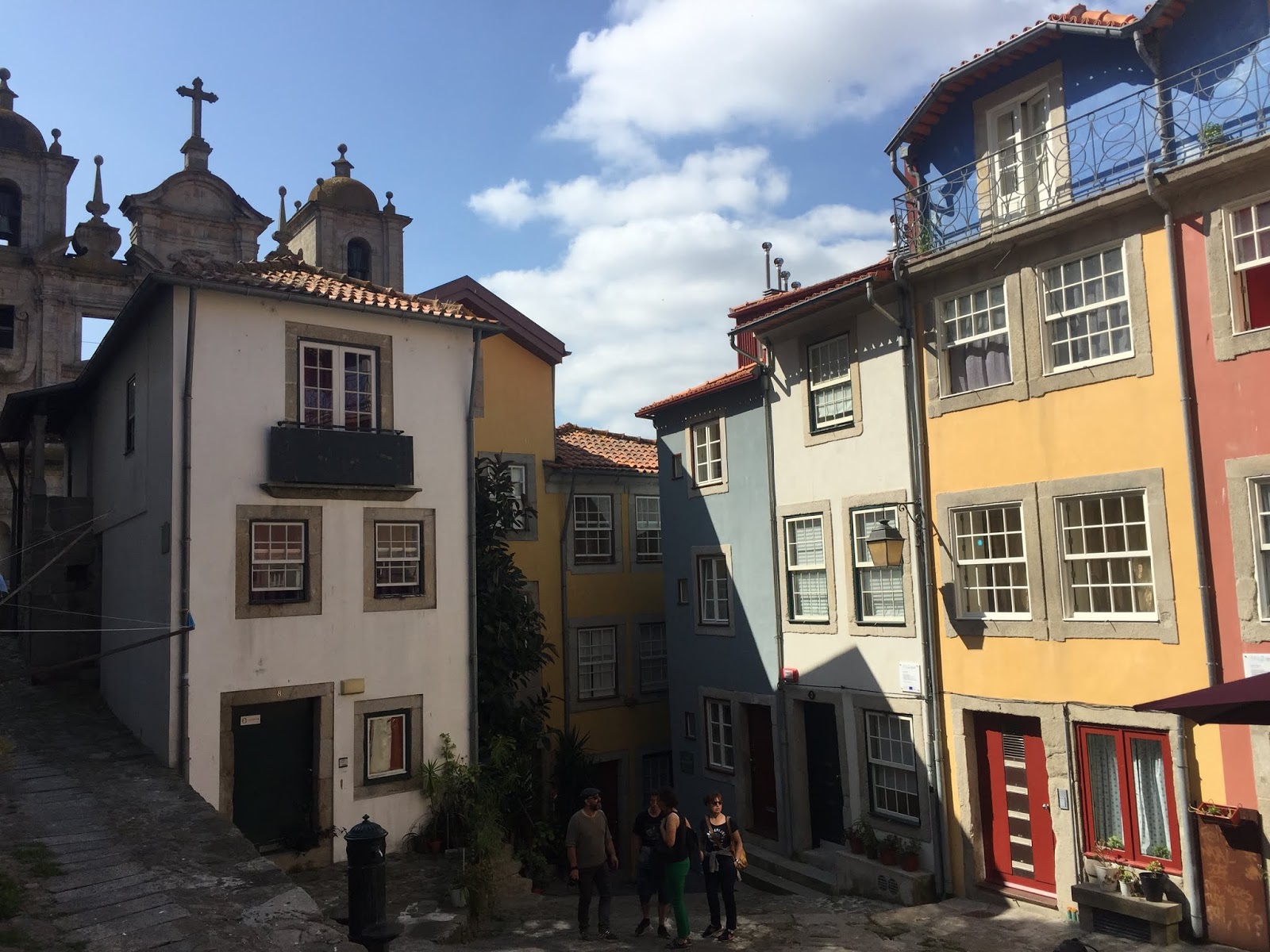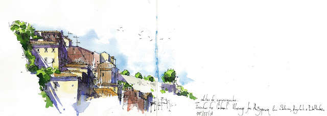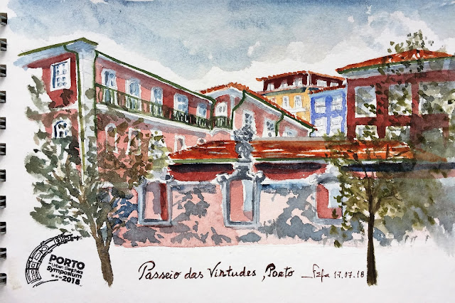 Fomos para um sítio lindo, por cima da Ribeira, num pequeno largo cheio de casas coloridas e de sombras fantásticas para usar o Indigo e o violeta. Pensei logo em como gostaria de lá voltar para usar todas essas cores num desenho (coisa que ainda não fiz...).