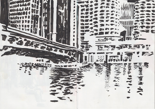 Quando, nos workshops de iniciação aos diários gráficos, dizemos que o mundo todo cabe dentro dos nossos cadernos não estamos a considerar uma viagem a Chicago. Não consegui mesmo acertar com estas escalas e grafismos. Devia era ter-me inscrito num daqueles workshops avançados que falam de deformações e torcidões...