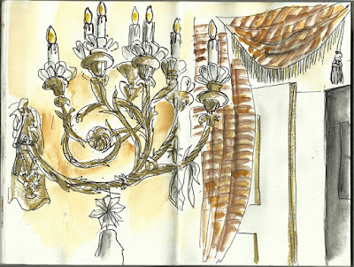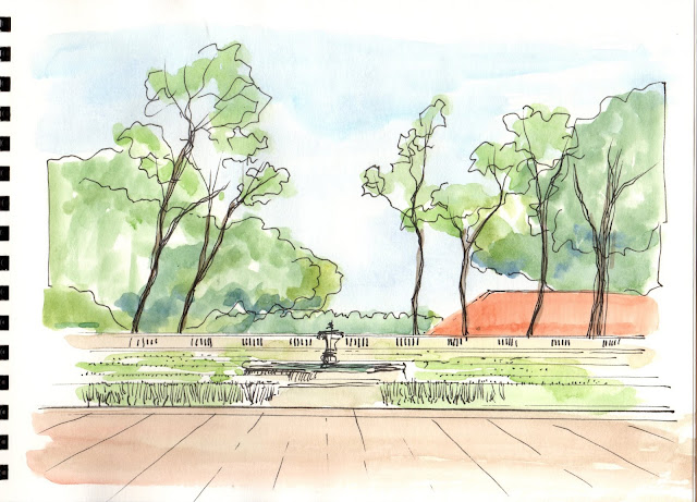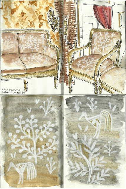 Andei a deambular por ali. Primeiro pelas salas. A sala dourada tinha tanta coisa para desenhar... (houve até quem não saísse de lá). Mas optei por desenhar só a vista a partir da janela. Aqueles padrões de arbustos eram muito difíceis de traduzir no desenho. No meu blog há mais tentativas, vistas de outros ângulos, de como tentei registar no papel aqueles autênticos quebra-cabeças.