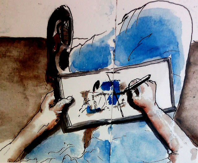 Há dias, por causa de uma espera entre diários gráficos que terminam e novos que ainda não chegaram pelo correio, dei comigo a usar uns cadernos de folha mais fina e que não me satisfazem muito...acontece que nestes é mais fácil desenhar "à maluca"...Vai daí, com a pressa de o acabar rapidamente, desenhei furiosamente quase sempre desenhos de dois ou três minutos e sem critério com o propósito de o "gastar" num fim de semana. Era ainda assim muito ambicioso. Mas numa semana ele foi para o armário, com o nº 43.