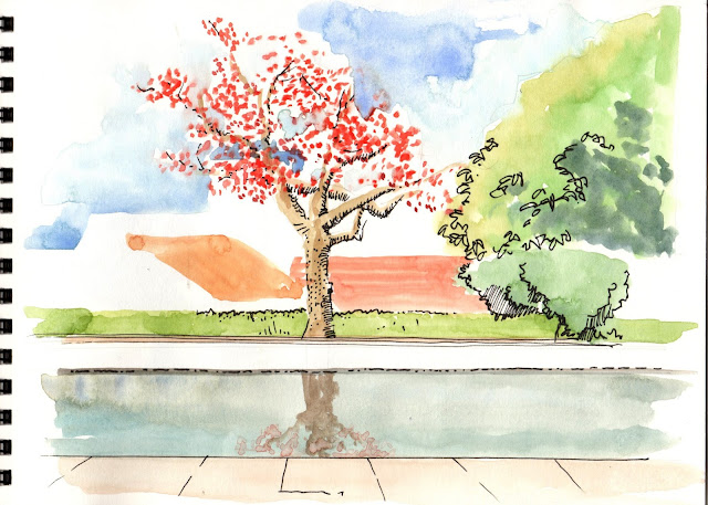 Sentei-me à sombra a desenhar estes bancos no jardim de Miraflores. Uma imagem de puro silêncio, bancos vazios e solitários à sombra... no entanto, mal tinha começado a desenhar o banco que estava mais próximo, apareceu um senhor que se sentou por poucos minutos. De repente aquele recanto ganhava outra vida e então saltei para a página ao lado para o captar. Esteve lá pouco tempo, perguntou-me as horas e logo se foi. Gosto disso no desenho urbano (ou desenho ao vivo como queiram chamar), a possibilidade de captar momentos esquivos, como se apanhássemos moscas com pauzinhos para logo as libertar.