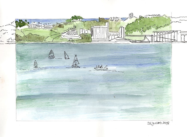 No fim, pudemos escolher algumas cores e pintar um pouco a vista sobre o Centro de Congressos da Alfandega, com a ajuda dos amigos do guaches, os lápis, claro que optei por alguns tons menos naturais e uma atmosfera entre o vinho e o barro quente de fim de tarde.