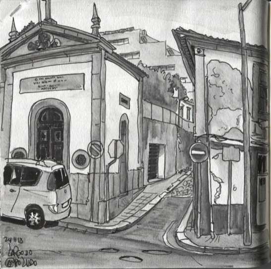 Abrigado numa paragem, o risco da tarde teve lugar no desenhável Largo do Campo Lindo, que pede novo encontro para dias mais soalheiros. Os tons pardacentos convidavam menos às cores e mais a umas experiências com grafite aguarelável.